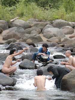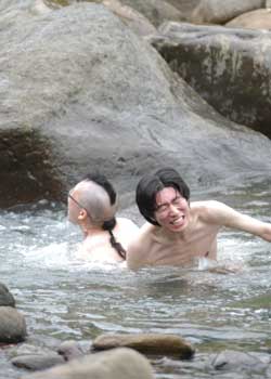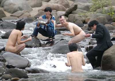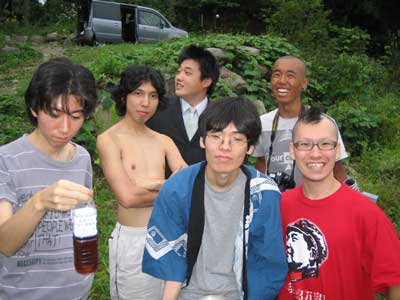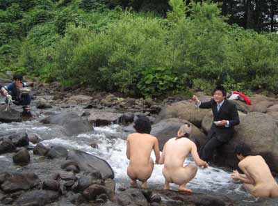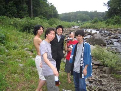 「夏といえば流しそうめん!今年は絶対やろう!」 すべてはこの一言から始まった。 で、流しそうめんに必要なモノを考えてみました。 ・そうめん ・そうめんを流す竹 ・水 う〜ん。 そうめんと水はなんとでもなるのですが、竹が問題です。 俺達の地元は豪雪地帯なので、竹が生えていないのです。 「困ったなあ・・・。」 「竹なんて生えてないもんなあ〜」 「てか、竹を手に入れても、割って台にするのとか面倒だよね。」 「普通にそうめん食べようぜ〜」 (ハルキ) なんだか色々考えると面倒なので、来ちゃいました。 ・ ・ ・ ・ ・ ・ ・ ・ ・ ・ ・ ・ ・ ・ ・ ・ ・ ・ 川に。 誰かが、「川で直接流せばいいじゃない」って言ったのが原因です。 ハッピを着たづやがそうめんを流す係り、ゴウは撮影係、他は食べる係りになりました。 てか、紳さんはすでに裸です。 そしてハルキはスーツ姿・・・、さすが企業戦士! さあ、いよいよ流しそうめん大会の始まりです! ・ ・ ・ ・ ・ ・ ・ ・ ・ ・ ・ ・ ・