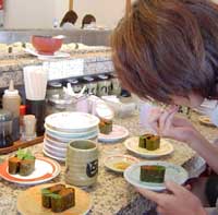 まず、彼女は流れてきたメロン(デザート)をいきなり手にしました。