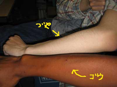 8/11 【お空の下で遊ぶしねぇ?】 おい、俺たちのサイトの名前はなんだ!? ゴウ は、はい。『お空の下で遊ぶしねぇ?』です。 づや そうだ。お空の下で遊ぶしねぇ? だ! よし、づや。腕を出せ。 は、はい。 ・ ・ ・ ・ ・ ・ ・ ・ ・ ・ ・ ・ ・ ・ ・ ・ ・ ・ ・ ・ ・ ・ ・ ・ ・ ・ ・ ・ ・ づや、色白すぎ。 てか俺黒すぎ・・・。
