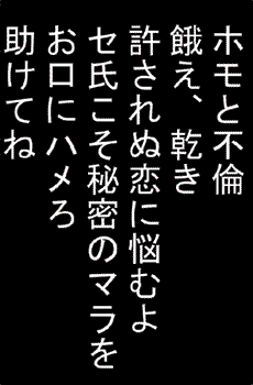 12/14 【暇人】 こんにちはゴウです。 先日、マッチーと紳さんがこんなモノをくれました。 なにやら紙ナプキンに文章が書いてあります。 紳さんとマッチーが言うには 「デニーズで、3時間かけて考えた文章」 との事。 どんな文書かと思ったら・・・ まったく意味がわかりません。 まぁなんとなくカッコイイ文章ではありますが・・・。 こんな文章を作るのに3時間もかけるなんて、すげぇ暇人だなって思ったら、 この文章はね、 『あ』から『ん』までの46文字を、一つずつ使って作られた文章なんだよ。 !? 確かめてみると、確かにそうです。 46文字を一つずつ使って作られています。 どの文字も重複していません。 しかも濁点や、小さい『ゃゅょ』などは使われていません。 こんな文章を考えられるなんて・・・ マッチーと紳さんってすげぇ・・・ すげぇ・・・ すげぇ暇人ですよね!!