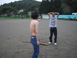 12/30 【今年のまとめ】 うーん、今年は色々とあったなぁ。 こんにちはゴウです。 2004年は、お空の下で遊ぶしねぇ?を立ち上げた記念すべき年でした。 飽きっぽい俺がまさかこんなに続けられるとは・・・。 自分でもビックリです。 2月にサイトをなんとなく立ち上げて、その後いろんなネタを撮りました。 づやのケツに火をつけ、 ナタクの髪を刈り上げ、 紳さんを冬の海へと走らせ、 マッチーを生き埋めにし、 ハルキを田んぼで裸にし、 実の弟を燃やしました。 そんな感じで、この一年はとても充実した年でした。 (俺的には、やりたい放題でした) 来年もこんな感じで充実した年に出来ればいいなぁと思います。 メンバーには、来年も強制的に付き合ってもらいます。 そういうわけでよろしく!