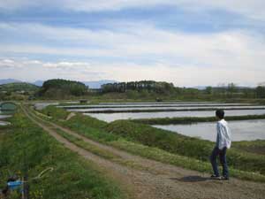 いました。ハルキの親父さんです。ハルキの婆ちゃんと2人で、田植えの準備をしていました。そして強制的に手伝わされるづやと俺。