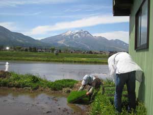 山にはまだ雪が残っていますが、田植えの準備です。