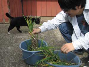 大量のネギの苗。ちなみにづやはネギが大嫌いです。ハルキの婆ちゃんがネギをあげると言った時に、すごい不愉快な顔をしていました。失礼だぞづや!