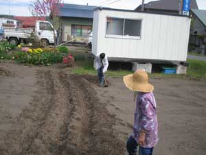 いよいよウネ作りです。鍬(クワ)を使って地道な作業です。づやの婆ちゃんも心配そうに見守ります。