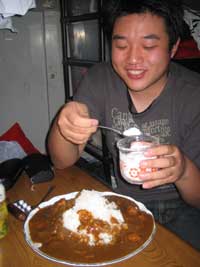 大盛りカレーに砂糖をふるハルキ。