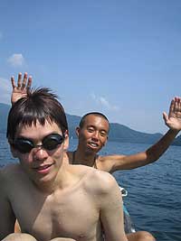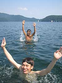 3人で素もぐり大会をしました。みんな5mくらいは潜れました。