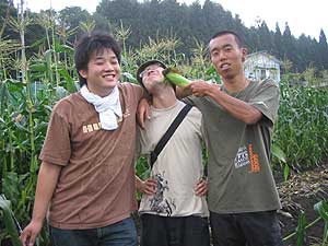次にハルキの家の畑でトウモロコシを採りました。