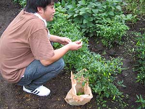 次はづやの家に行って、俺とづやが育てた野菜を収穫しました。これはシシトウを採っているハルキです。
