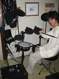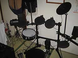 狭い東京のアパートでも練習出来るようにデジタルのドラムセットです。でも、アンプを通してかなりいい音が出ます。