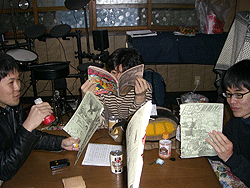 まずは、早売りの店で買ってきた今週のジャンプを4人で分けて読みました。みんな真剣です。コレを読まないと練習は始められません。