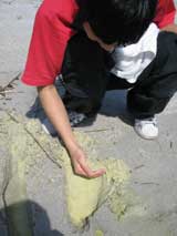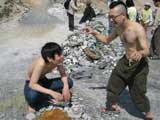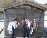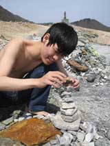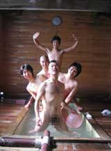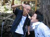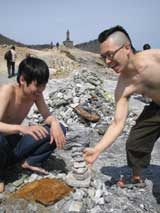 日本三大霊場のひとつである恐山。 我々の様な変態が、軽々しく行っていいのか不安ですが、楽しんできました。 境内には温泉もあり、とても素敵な場所でした。 それではどうぞ。 恐山へと伸びる街道の途中に、湧き水がありました。 『冷水』という名で、恐山へ行く前に、この水で手を洗い、口をゆすぎ、身を清めるそうです。 デブ如何なる時も水分を欲す。 1杯飲んで10年、2杯飲んで20年、3杯飲めば死ぬまで若返るという不思議な水。 我々もこの水を飲んでから恐山へと向かいました。 恐山境内。 入り口で参拝料500円を支払い、いざ境内へ。 いたる所から硫黄が噴出していて、草木はほとんど生えていない。 積み上げられた石と、カラカラと回る風車が哀愁を誘います。 まずは、境内にある136の地獄を巡る事にしました。 ・ ・ ・ ・ ・ ・ 賽の河原で石を積む。 づや、いきなり大暴走。 おもむろに服を脱ぎだし、石を積み始めます。 鬼・登場。 当然の如く、鬼の登場。 後ろの観光客が 『ねぇ、あの人達なんで裸なの〜?』 と言っていましたが、彼らには聞こえません。 オラ。 やはり鬼です。 づやがせっかく積んだ石を、容赦なく壊します。 ケーッケッケッケッケ・・・ 『うわーん』 ・ ・ ・ ・ ・ ・ ・ 青森まで来ても、変態は変態か・・・ 次に我々は、宇曽利山湖の湖畔へ。 ここは極楽浜とも呼ばれ、その名の通り美しい場所でした。 宇曽利山湖。 白い砂浜。 硫黄。 こんな感じで、砂浜を掘ると、硫黄の層が出てきます。 次に我々は、楽しみにしていた温泉に入る事に。 境内には5つの温泉があり、参拝者は無料で入ることが出来るのです。 まずは、『冷抜の湯』に入りました。 冷抜の湯の前で。 冷抜の湯。 中は、すごく綺麗。木の匂いがして、とてもリラックスできました。 湯船は少し小さめですが、人が少ないので、落ち着いて入れました。 次に、すぐ近くにある『薬師の湯』に入りました。 薬師の湯の前で。 浴室での一枚。 ナタク・・・前を隠せ!!! と、こんな感じで、恐山を満喫しました。 ゴールデン・ウィークだけあって、観光客は多かったのですが、 温泉に入る人は少なかったです。 まさに天国のような場所でした。 アクセスは不便ですが、また行きたいです。