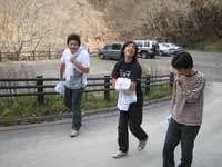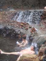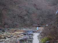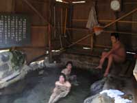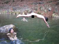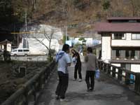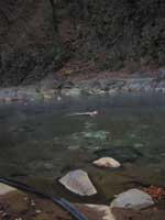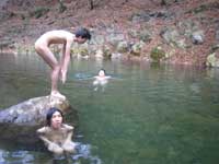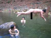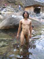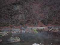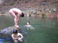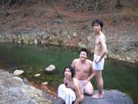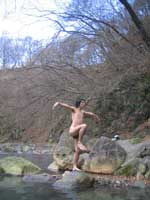 11月28日に、群馬県にある尻焼温泉に行って来ました。 今回のメンバーは、ゴウ、ハルキ、紳さん、マッチーの4人。 みんなでハルキの車に乗って出発です。 高崎から車で走る事2時間弱。 群馬県六合(くに)村へとやってきました。 尻焼温泉の専用駐車場に車を止めて、そこから200mほど歩きます。 小さな温泉街もありました。 宿泊する事も出来るようです。 そこから、川原に沿って小さい道を歩いていくと・・・ ありました。尻焼温泉です。 こんな感じで、川が丸ごと温泉になっています。 とにかく広い! もちろん泳げますし、深い所では足がつかなかったです。 すげえ気持ちいい。 座っていると、下から熱湯が湧き出てきます。 まさに尻が焼けるようでした。 紳さんはいつでも人目を気にしません。 葉っぱで陰部を隠すが、なんとも微妙なところ。 小屋の中にも湯船がありました。 こちらはかなり熱め。 こんな感じで、ずっと温泉につかっていました。 体が温まったのでいよいよ本領発揮です。 尻焼温泉の下流(温泉ではありません) 気温は8℃。 大丈夫。体は十分温まっている。 マッチー。 ジャーンプ。 ハルキも。 ジャーンプ&ブラーン。 非常に楽しい温泉でした。 今まで入った温泉の中で、一番自然度が高かったです。 ちなみにこの温泉は、梅雨時や台風で川が増水している場合は入れません。 下記サイトに毎日の状況が載っていますので、行かれる方は参考にしてみて下さい。 ■温泉三昧のすすめ尻焼温泉