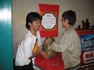 デックス東京にある隕石を持ち上げようとする湯肉さんとづや。でも、それは隕石じゃありません。台座に固定された因縁石です。二人は素で騙されてました。